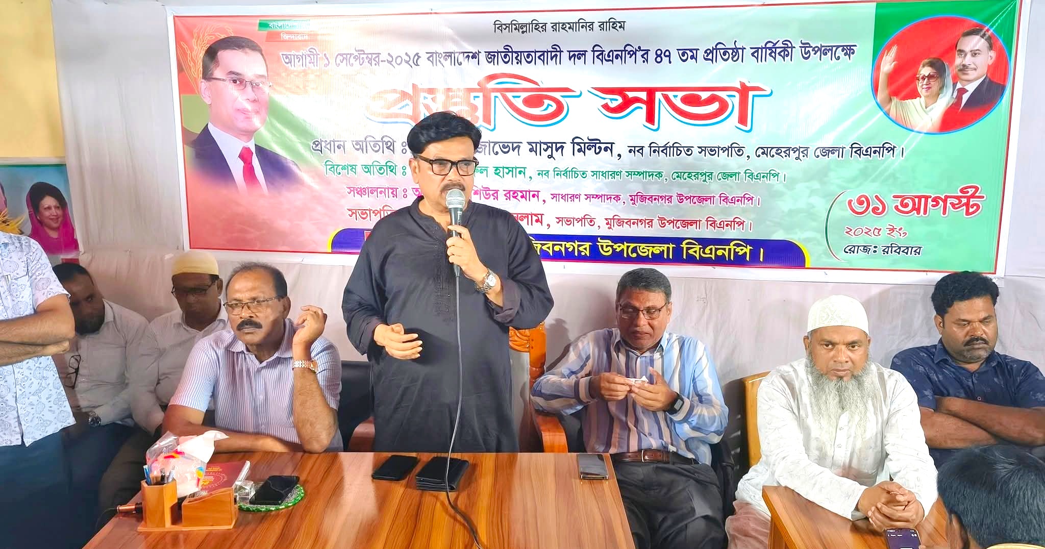 মেহেরপুরের মুজিবনগর উপজেলা বিএনপির উদ্যোগে এক আলোচনা সভা অনুষ্ঠিত হয়েছে। বুধবার বিকেলে মুজিবনগর উপজেলা বিএনপির কার্যালয়ে এ সভার আয়োজন করা হয়। উপজেলা বিএনপির সভাপতি আমিরুল ইসলামের সভাপতিত্বে অনুষ্ঠানে প্রধান অতিথি হিসেবে উপস্থিত ছিলেন মেহেরপুর জেলা বিএনপির সাধারণ সম্পাদক অ্যাডভোকেট কামরুল হাসান। বিশেষ অতিথি হিসেবে উপস্থিত ছিলেন জেলা বিএনপির সাবেক সহ-সভাপতি আলমগীর খান ছাতু, জেলা সাংগঠনিক সম্পাদক ওমর ফারুক লিটন, সদর উপজেলা সাধারণ সম্পাদক সাহিদুল ইসলাম এবং মুজিবনগর উপজেলা সাধারণ সম্পাদক হাজী মশিউর রহমান। মুজিবনগর উপজেলা যুবদলের সদস্য সচিব আনারুল ইসলামের সঞ্চালনায় সভায় আরও উপস্থিত ছিলেন উপজেলা বিএনপির সাংগঠনিক সম্পাদক হারুন অর রশিদ, যুগ্ম সম্পাদক মানজারুল ইসলাম ও সাইফুল ইসলাম, মহাজনপুর ইউনিয়ন বিএনপির সভাপতি আশরাফুল হক কালু, বাগোয়ান ইউনিয়ন বিএনপির সভাপতি রফিকুল ইসলাম ও সাধারণ সম্পাদক ইসলাম আলী, মোনাখালী ইউনিয়ন বিএনপির সভাপতি রায়হান কবীর ও সম্পাদক আনিসুজ্জামান টুটুল, মুজিবনগর উপজেলা জাসাস সভাপতি ও কণ্ঠশিল্পী খুলনা বেতার মো: জুলফিকার খান হেলাল, জেলা যুবদলের দপ্তর সম্পাদক হাবিবুর রহমান ভিকুসহ উপজেলা বিএনপি ও সহযোগী সংগঠনের নেতাকর্মীরা।